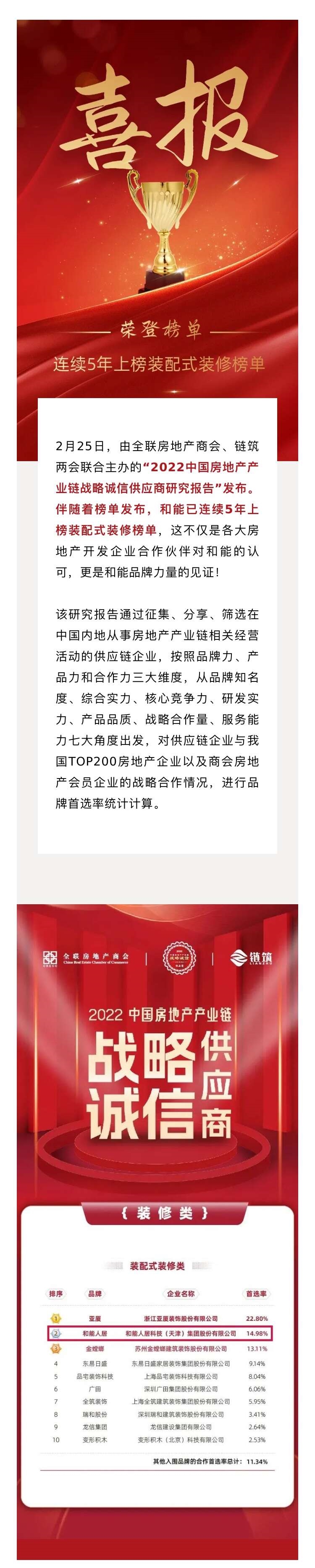 喜訊!和能連續五年上榜《2022年中國房地產產業鏈戰略誠信供應商研究報告》,品牌持續向上,聚力新開局!